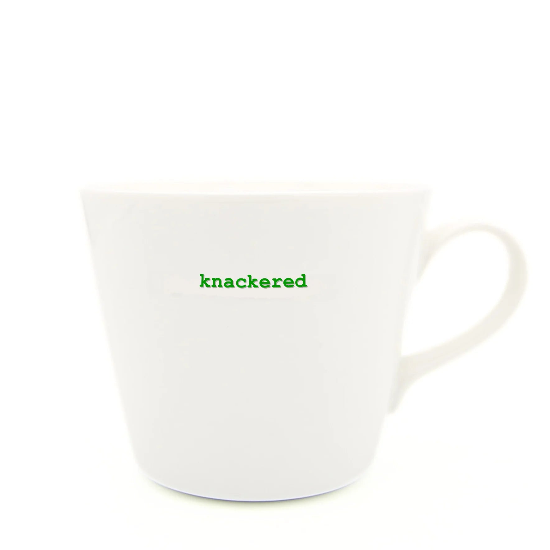This delightful Keith Brymer Jones mug is the perfect addition to anyone’s life. Designed right here in the UK and crafted from the finest super white porcelain this standard bucket mug has the word “knackered” inlaid in a retro typewriter font.
