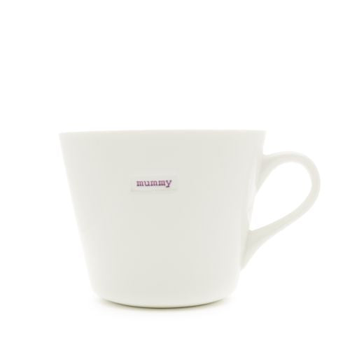 This lovely Keith Brymer Jones mug is the perfect addition to anyone’s life. Designed right here in the UK and crafted from the finest super white porcelain this standard bucket mug has the word “mummy” inlaid in a retro typewriter font.